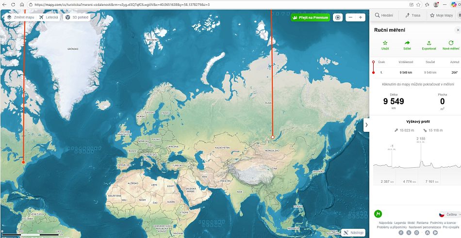 Tak jsem se schválně koukal, co mapy.cz nabízí. Koukal jsem na to na mobilu. Zobrazení ať už plošné nebo kuželové od pólu nenabízí. Jediné zobrazení je nějaké kuželové s celou Evropou, Ruskem, Atlantikem a Grónskem. To, že to vidím celé, vůbec neznamená, že tam vidím nejkratší vzdálenosti. Vůbec si neuvědomuješ, jak deformované to zobrazení je. Pro určení dráhy balistických raket je to zcela nepoužitelné.