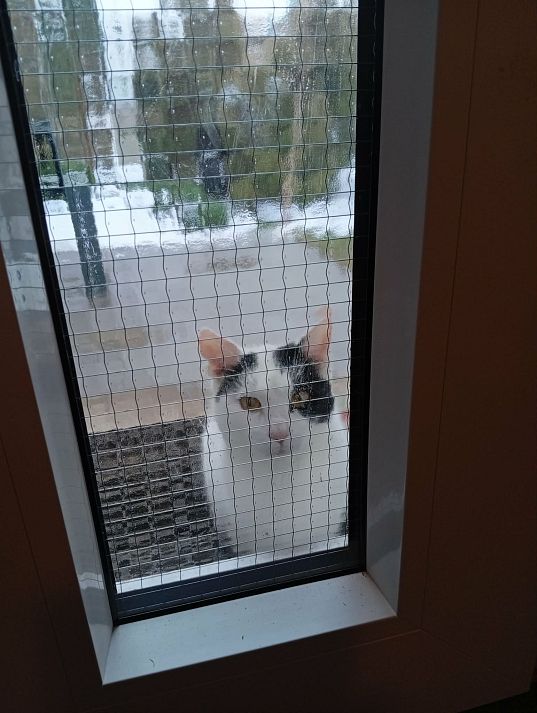 To je drátosklo, čili pletivo zalité v tabuli skla. Natřít ho jsem myslel tak, aby sklo nebylo průhledné a mňoukající kolega nás nemohl takhle brutálně citově vydírat :-)
