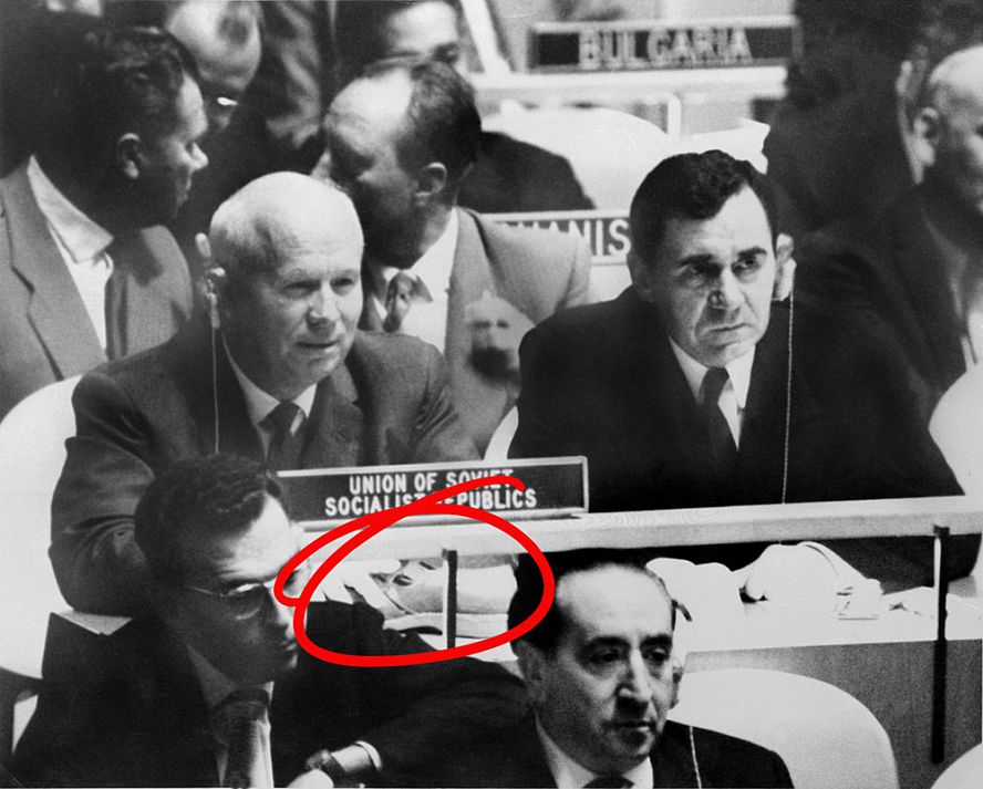Chruščov je populární i svým vystoupením v OSN, kdy mlátil botou do stolečku :-)))