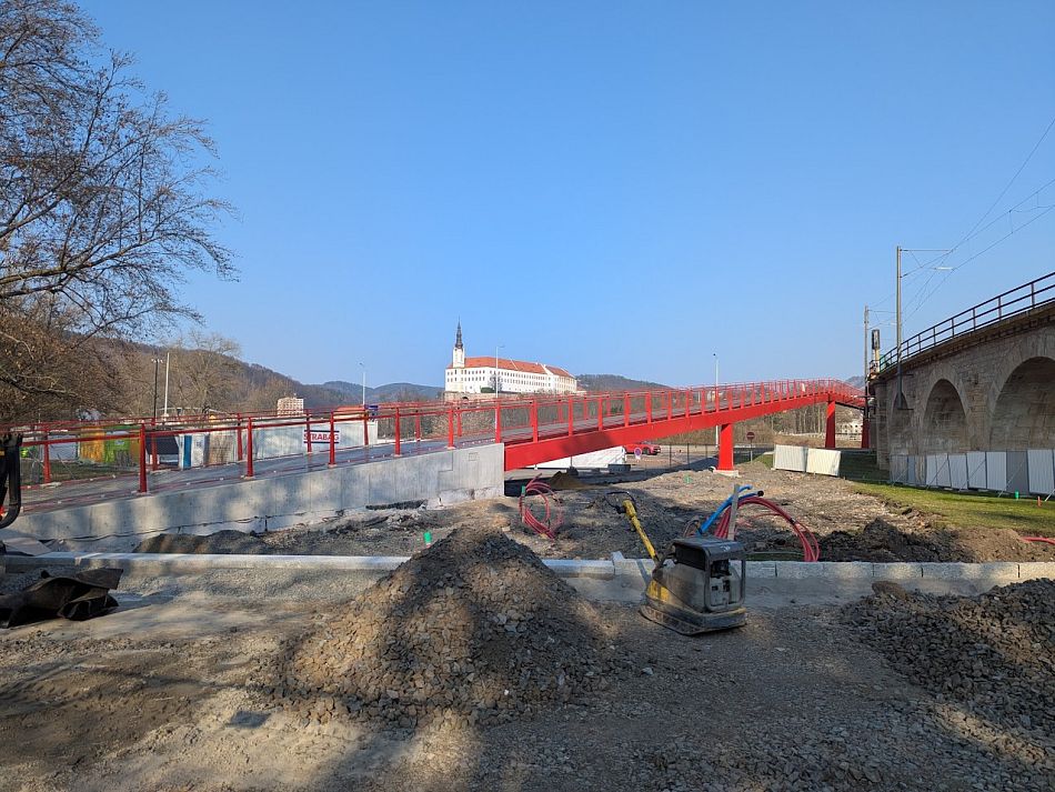 U krčku ventilku. Zkusil jsem to zalepit okrajem fleku, ale nevydrželo to, takže na druhý pokus tam šla nová duše. Snad půl hodiny jsem se s tím babral. Tak jsem si alespoň prohlíd dokončovanou lávku přes Labe!