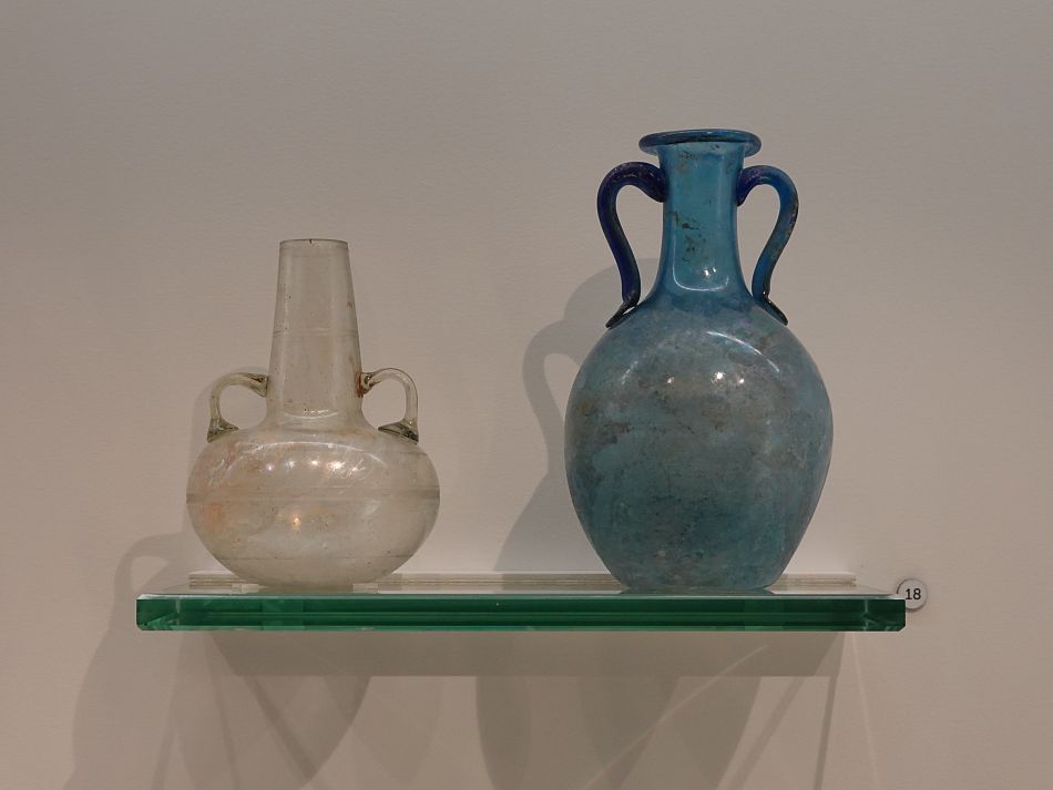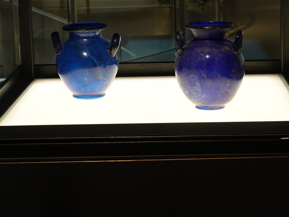 Ty modré nádoby, jestli myslís tyhle, jsou pohřební urny z 1-2. století našeho letopočtu.