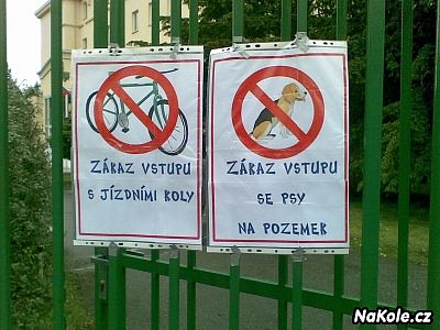 Ale vážně: celá potíž je v tom, že ta cedule nemluví o JÍZDĚ na kole (to by bylo pochopitelné a z hlediska bezpečnosti by to mělo význam), ale o VSTUPU S KOLEM, což je nesmysl a kravina. Předpokládám, že když projdeš branou na svůj pozemek, na kole sice nejedeš, ale nenecháváš ho kvůli bezpečnosti svých synů PŘED branou. A to je to, co se ti snažím celou dobu vysvětlit. :-)))
