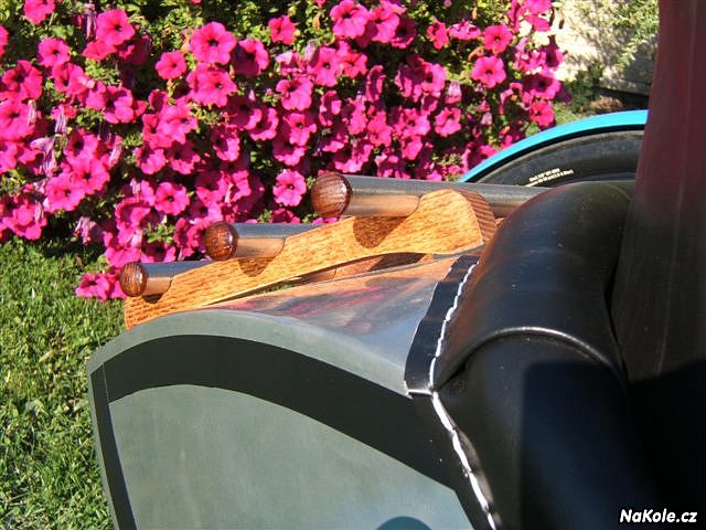 Co se sedačky týče, je to potažená klasická plastová sedačka na kolo, takže je malý jištěný tříbodovými popruhy. Potah je tam jen estetickou záležitostí, aby to ledilo. Blatník dělal klempíř. Je ze dvou kusů a prolisy jsou dělaný na signovačce.
