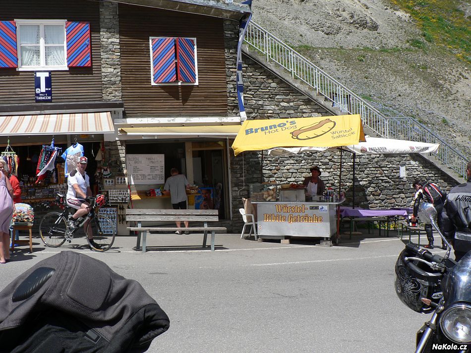 A v sedle Stelvia si nezapomeň dát opečeného buřta v chlebové bagetě se zelím. Je to ňamka. Prodává to tam takovej srandovní "Tyrolák" a umí pár slovíček z každé tam obvyklé řeči, i z češtiny :-) Směrem nahoru na levé straně u zídky.