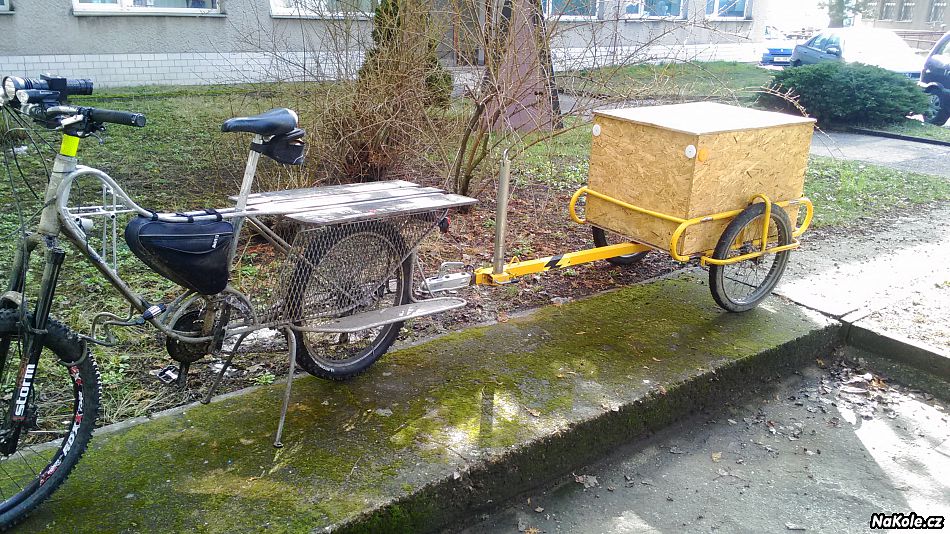 Nevyráběl jsem celý vlek za kolo, na to nemám nářadí/schopnosti/čas. Použil jsem s výhodou kárku, která léta bydlí na chalupě, vyrobil jsem pouze novou rukojeť pro připojení ke kolu. I původní rukojeť je ke kárce přišroubovaná, čili rukojeti lze snadno měnit a původní funkce chalupové kárky je zachovaná.