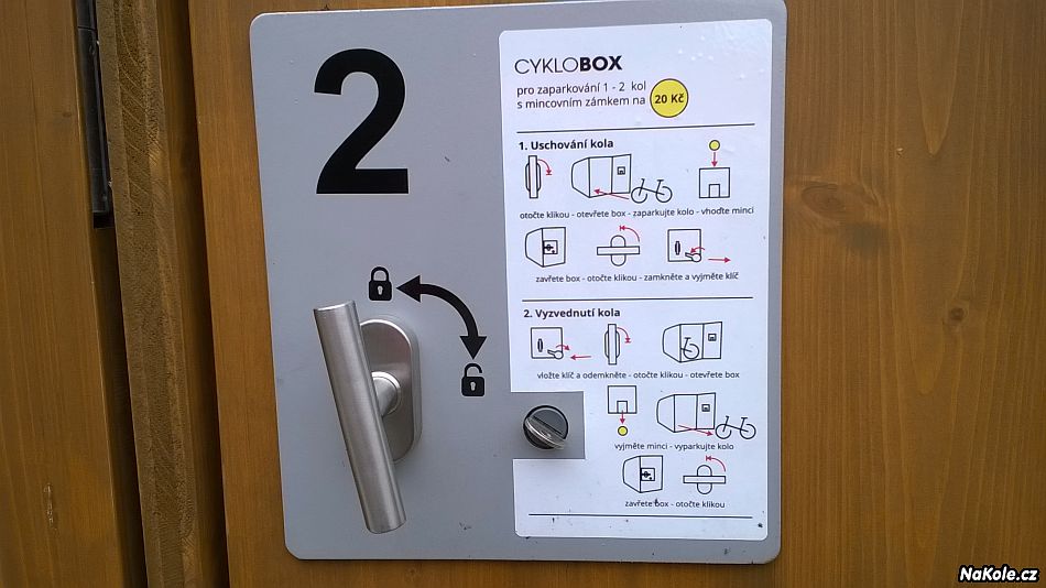 Jinak ty boxy jsou docela vymakaný. Do jednoho boxu se vejdou dvě kola. Pokud je box prázdný, dá se kličkou otevřít a po vložení kola se z vnitřní strany dveří dá do zámku dvacetikoruna a po uzavření dveří se klíčem zamkne a ten se pak dá vyjmout. Pokud tam ta dvacka není, tak se klíč vyjmout nedá. Při otevření se klíčem odemkne, vyjme se ta dvacka a po vyndání kol se dvířka jenom uzavřou kličkou. Škoda, že v tomto místě boxy nenajdou využití. Kdykoli jsem jel okolo, tak boxy byly prázdné.