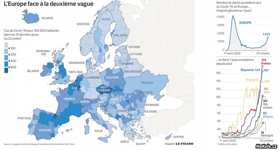 "Ani východní Evropa není proti nárustu imunní. Pravě v České republic je situace nejvíce alarmující: země zaznamenává 975 případů na 100 tisíc obyvatel za posledních 14 dní. Dvakrát víc než Francie! Vláda zavedla částečný lock-down (omezení pohybu a zavření obchodů, až na ty nezbytné) a objednala dalších 2000 lůžek, z nichž některá budou postavená v polní nemocnici na okraji Prahy."