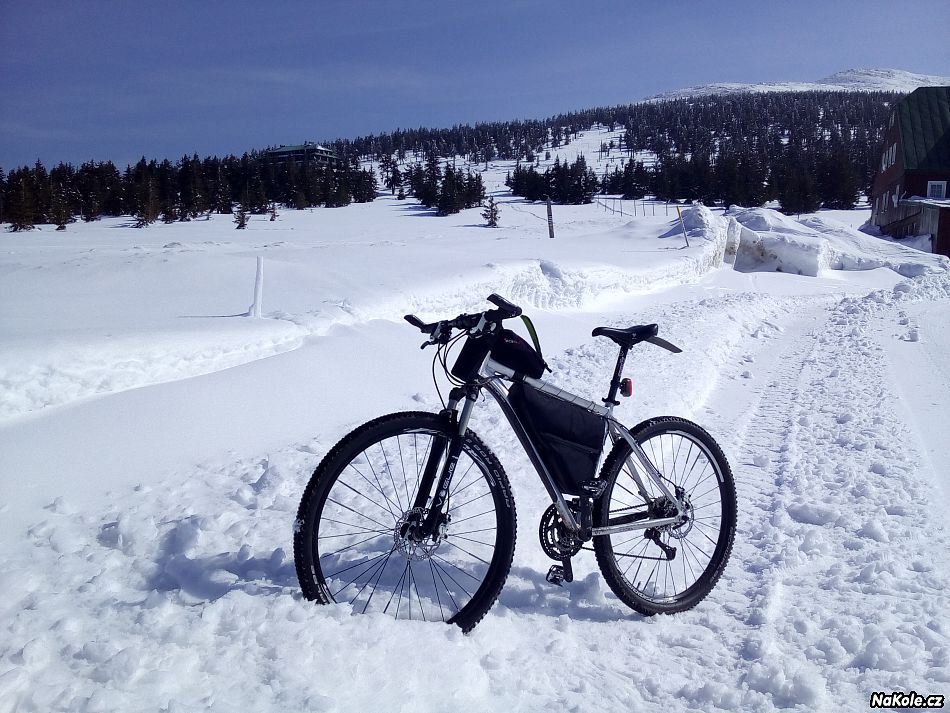 Ne na lyžích :-(, ale na kole, k Jilemnické boudě to šlo. Po dlouhé době se mi podařilo přesáhnout stovku - 107,5 km.