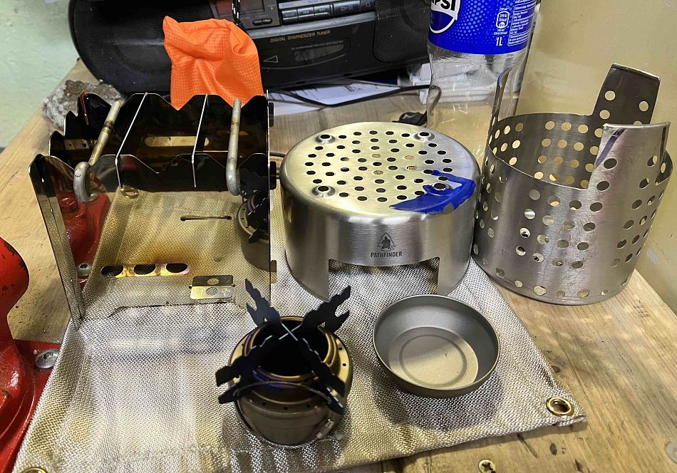 Tak tyto mám. Zleva skládací dřívkáč, pak stojan pod kyblík 1,9l Pathfinder a ten upravený odkapávač na příbory. Stojí na "nehořlavé" podložce z alíka a pro porovnání velikostí lihový vařič před nimi.