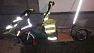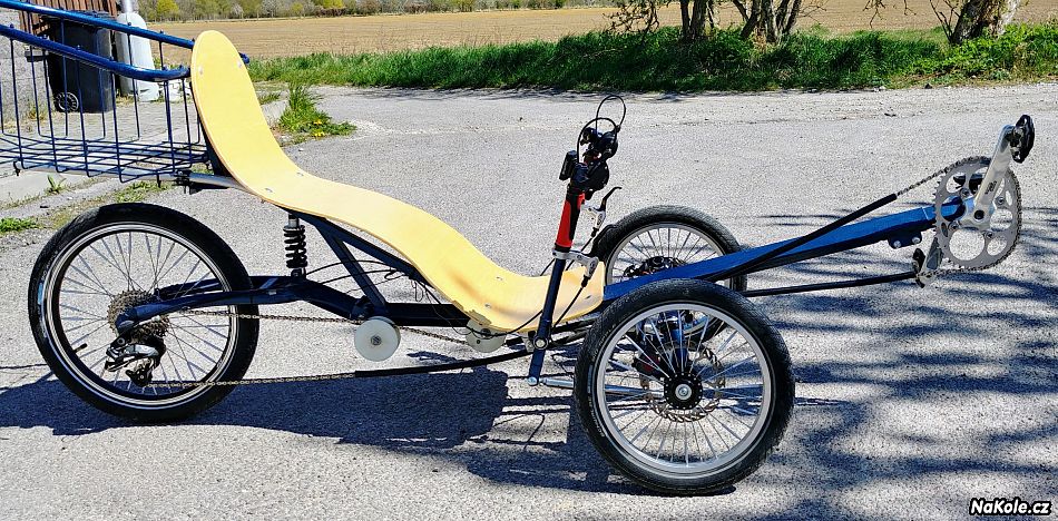 Má to nákladní prostor mezi koly vzadu, předek nákladního prostoru je šikmý jekl se dvěma klobovými oky. Na nich se naklápí pohonná sekce se sedačkou a krátkým jednoduchým náhonem na přední kolo. Řídítka jsou široká spodní, připevněná na zadní nákladní sekci. Tím pádem se nakláníš do zatáček celý, při zatočení doleva si jakoby lehneš na levou rukojeť řídítek a vzdaluješ se od pravé. Trochu divné řízení, ale výhoda je, že můžeš zastavit a nedávat nohy na zem - držíš se těch řídítek jako když na kole zastavíš u sloupu nebo zábradlí a chytneš se ho, abys nemusel dát nohy na zem. A přední kolo má dost zátěže pro trakci, sedíč přímo nad ním.