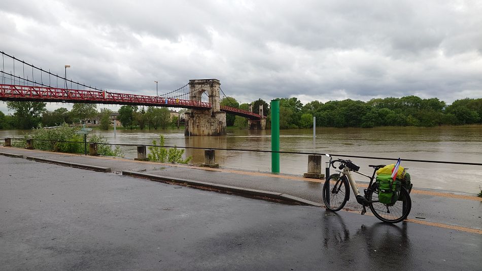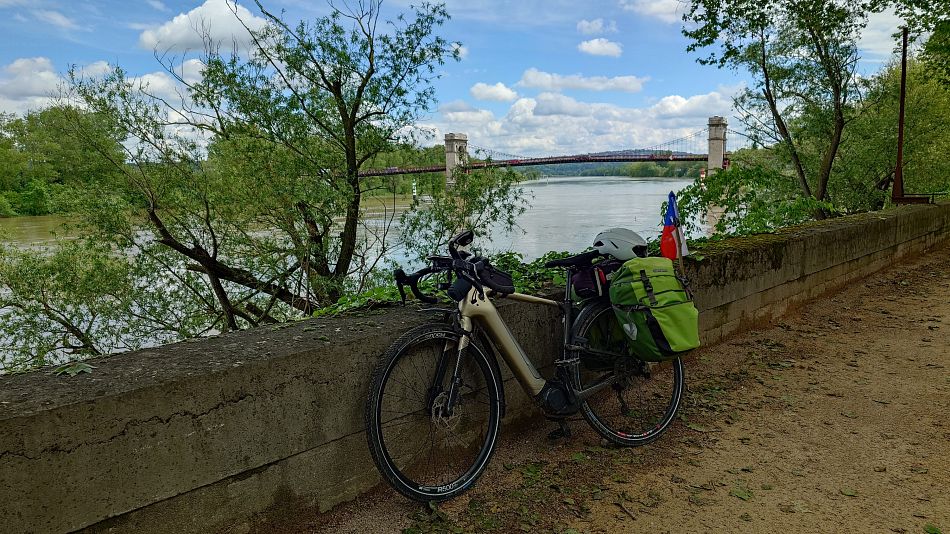 Fakt zajímavé místo, asi 5 km proti proudu je přehrada, nebo snad jez, mají tam zařízení, že mohou regulovat výšku hladiny. A zdá se, že protože výš hodně pršelo, tak upustili tím zařízením víc vody, tak to zvedlo tu hladinu asi ne na dlouho,protože tam fakt vede ta ViaRhôna.