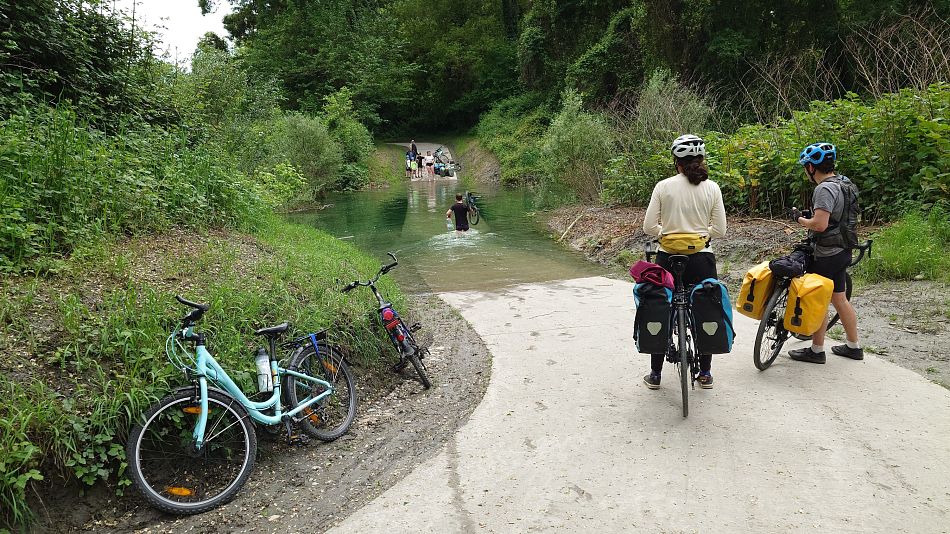 Máma v cerných bombarďách přenášela na zádech děti, ten chlápek kola. Pendlovali tou vodou statečně.