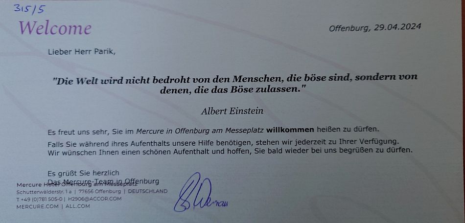 A pak už hotel mého řetězce, kde jsem tou superkafkou, dárečky, a uvítací dopis. Potřebuji se najíst a napít abych domyslel, co mi chce vedení hotelu naznačit.