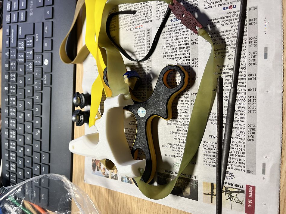 Tak se mně potencionální tiskař přeptal, jestli to chcu vytisknout z PLA, jak doporučuje autor, protože to není pak křehké jako PETG. Což může způsobit ulomení ramene a gumou katapultované rovnou do tváře. Tak mně to zarazilo. Silonovou tiskárnu nemá. Nakonec mi z toho zůstane jen údaje TOP SLOTU jako díra v průměru 3mm a štěrbina pro zasunutí gumy 1,5mm :-D