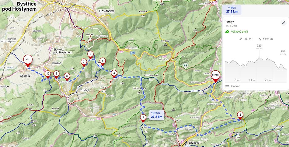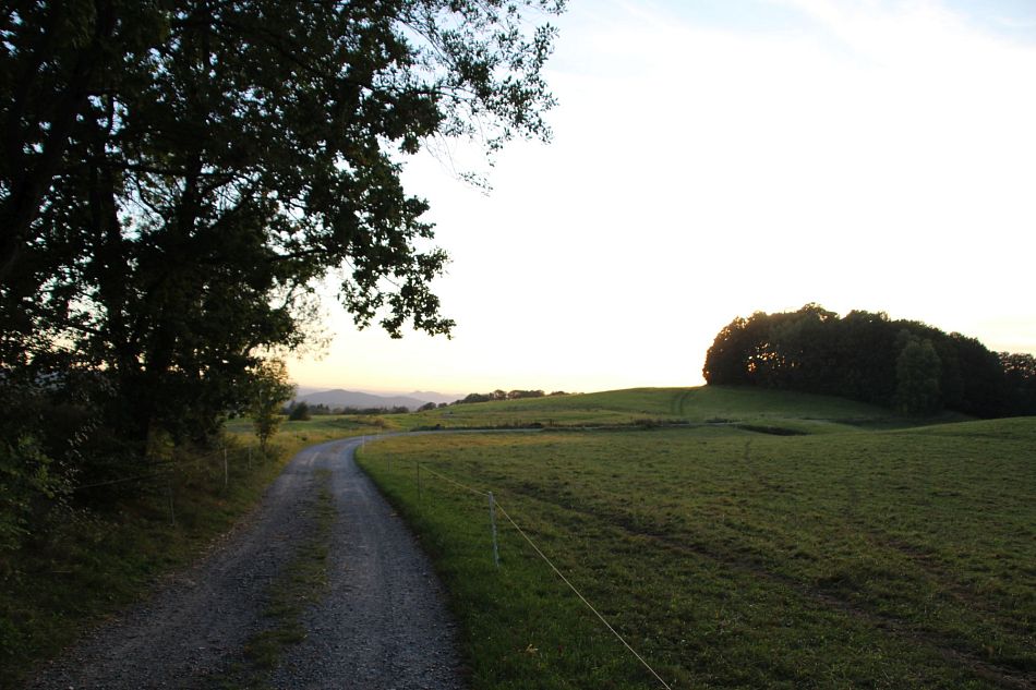 Ráno po nezbytné kávičce jsem se rozhodl, že nepůjdu po plánované, ale už notoricky známé, trase do Bystřice pod Hostýnem, ale radši budu poznávat další kouty této krajiny. Cílem bylo jenom dojít nějakou pěknou krátkou cestou k autobusové zastávce. Vybral jsem obec Chomýž s tím, že cestou navštívím zříceninu hradu Křídlo a využiju i nějaké neznačené pěšiny, kterých je v Hostýnkách nespočetně. Neznačené trasy taky kolikrát potěší třeba pěkným výhledem z lavičky pod stromem na rozkvetlé louce. Cesta, i když částečně po asfaltu, byla příjemná, vedla smíšenými lesy a zase všude božský klid. Dnes se mi šlo o hodně lépe než včera, nohy už nebolely a taky batoh byl bez spotřebovaného jídla a pití možná o 2 kila lehčí, Vydrápal jsem se na hrad Křídlo. Když se na Valašsku mluví o zřícenině hradu, tak můžete očekávat maximálně pár šutrů, kousek zdi a někdy jen náznak nějaké prohlubně v terénu. Totéž zde, ale vypadá to aspoň, že se využívá jako pěkné místo na táboření. Z cesty pod hradem je pak pěkný výhled do široce otevřené roviny. Seběhl jsem po asfaltce do Chomýže, abych si hloupě nechal ujet autobus a pak se poněkud komplikovaně dostával domů. Byl to zase jednou povedený víkend.