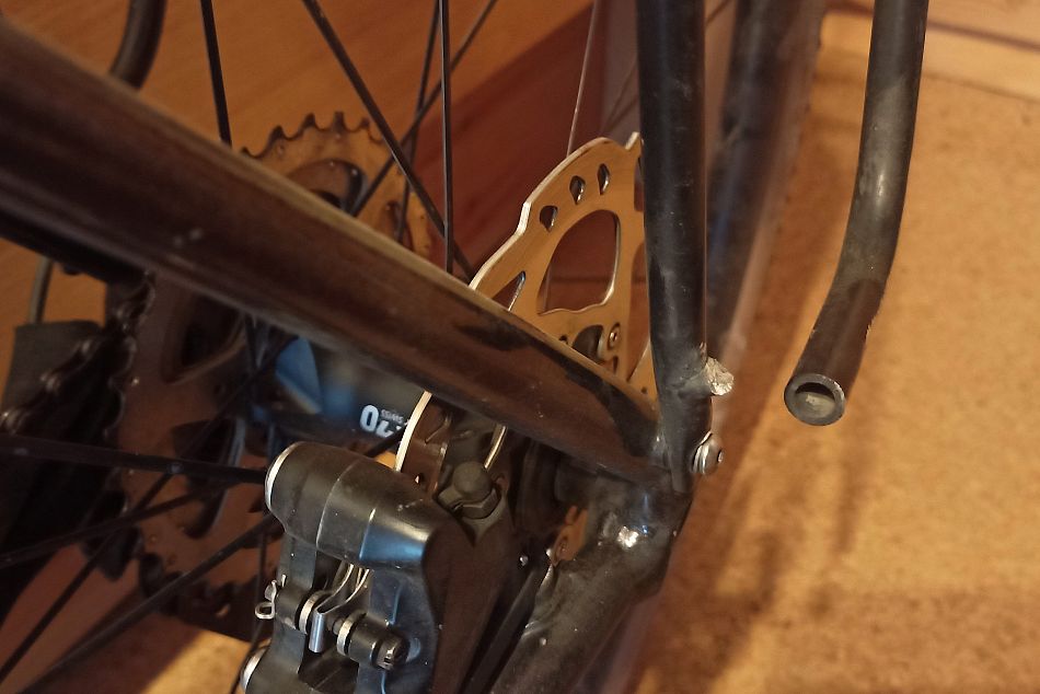 V dalším prudkém kopci si všimnu, že po tom, co se ozve zvuk trvá asi 4 otočení klik, než se řetěz na převodníku zavlní. Né moc, ale je to podezřelé. Na vhodném místě zastavím a znovu prohlížím řetěz... a najednou vidím článek, který je trošku širší než ostatní... protože nýt na jedné straně už nedrží v bočním dílku.