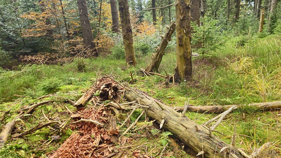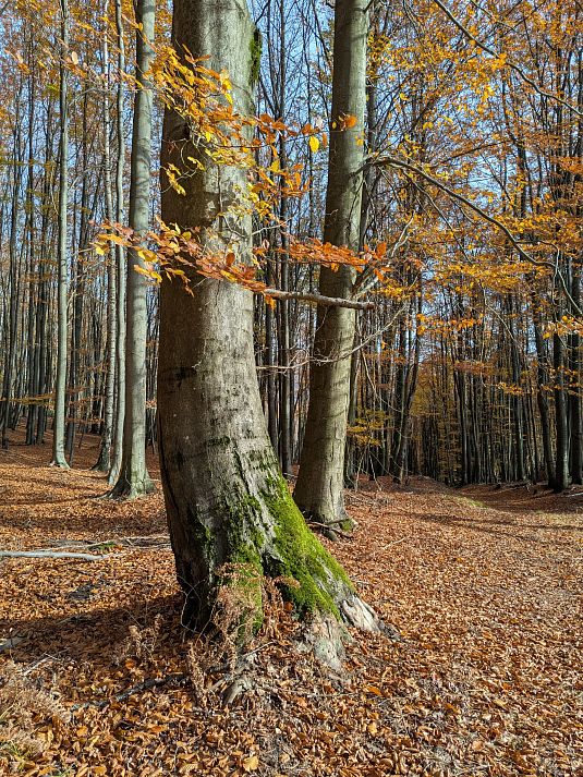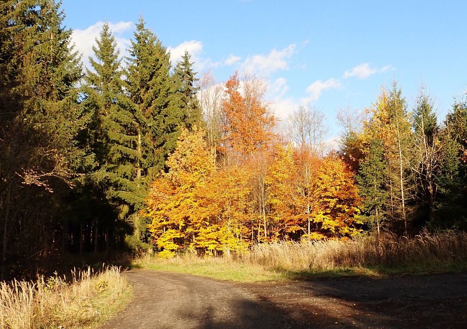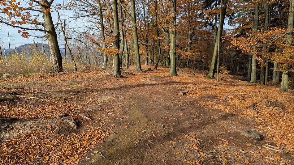 Předpověď mi ovšem zatajila, že ráno bude v Chocni a okolí docela slušně pršet. Jak jsem přijížděl autem k Chocni, tak kaluže nebyly moc přívětivé. Sedl jsem na kolo a vjel do lesů. Pěšiny a zvlášť ty zatravněné a plné jehličí se daly ždímat, ale moc to neklouzalo, tak jsem věřil, že se to bude časem zlepšovat a také ano, docela rychle cesty a pěšiny vysychaly a za hodinu už to pod koly nečvachtalo a po poledni příjemné teplo a sluníčko a na i na lehké podzimní oblečení docela teplo a už téměř úplné sucho.
