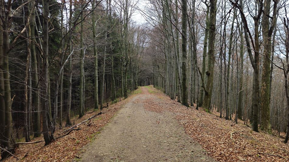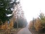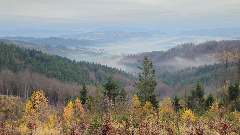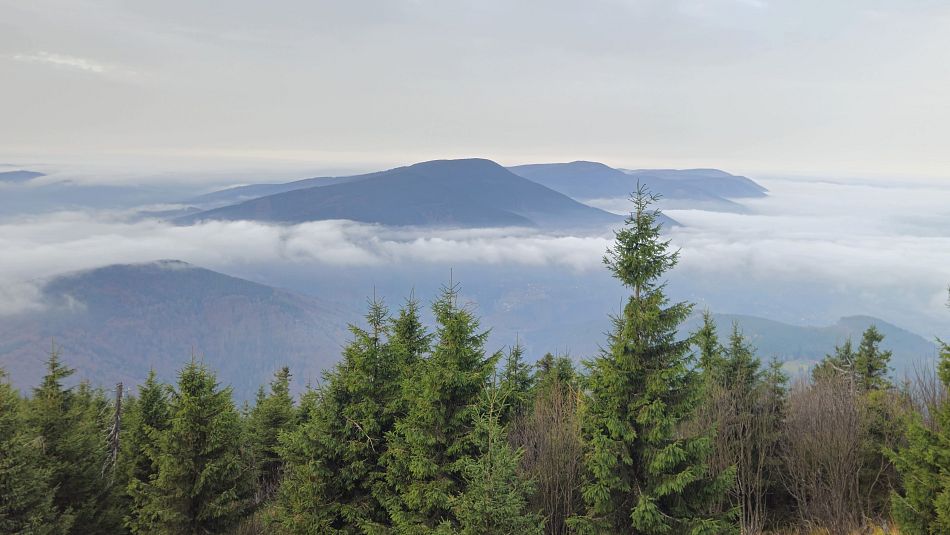 Protože je ještě brzy na návrat domů, rozhodnu se, že si cestou vyběhnu na Velký Javorník a podívám se na na Lysou z druhé strany. Plánuju nahoře poobědvat a porozhlédnout se po nějakém pěkném místě na budoucí bivak, s pěkným výhledem. Taky se chci podívat jak pokročila stavba cyklostezky a rekonstrukce parkoviště na Pinduli. První zklamání je parkoviště, které diky nové, velkorysé autobusové zastávce má tak poloviční kapacitu než dřív. A to už bývalo permanentně plné, Cyklostezka už je asi dotažená až po kruháč v Trojanovicích. Trochu problém je ten začátek na Pinduli, kam se z Rožnova nedá rozumně dostat. Cesta je frekventovaná a nebezpečná. V sedle je mlha, vyrážím do lesa po modré a doufám, že vrchol Javorníka s rozhlednou bude nad mraky. Marné naděje. Moc mi to nevadí, mám rád tu atmosféru zamlženého lesa, jenom mě zaskočilo, že jak se na stromech sráží vlhkost, tak z nich docela hezky prší. Hospoda je narvaná, nechce se mi postávat ve frontě, tak zkusím okýnko za rohem a dostanu bez čekání celkem dobrou zelňačku.