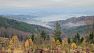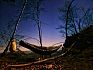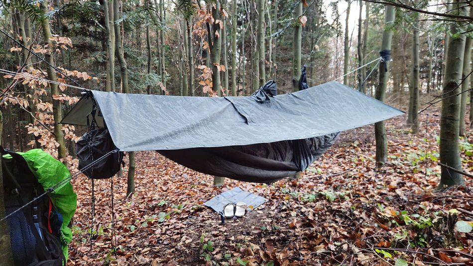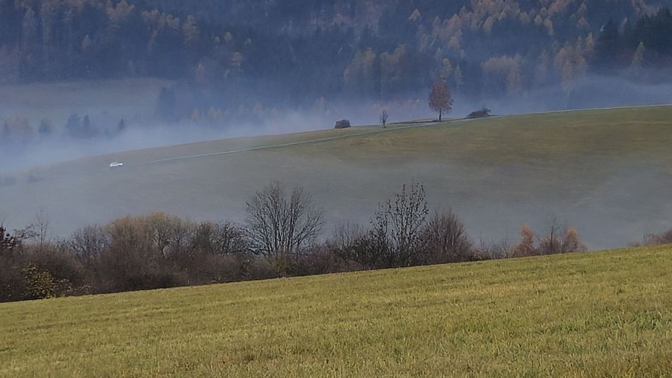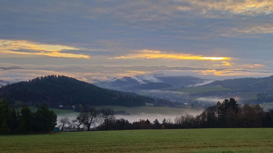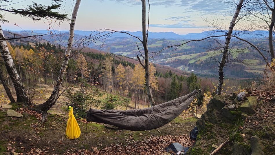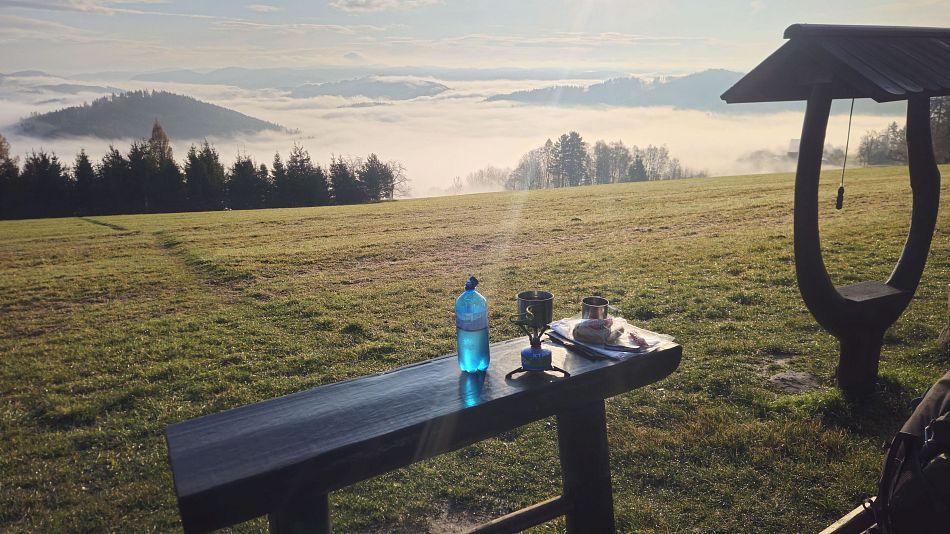 V lese poblíž vyhlídky jsem zabíjel čas stavěním improvizovaného přístřešku z ponča. Pro člověka na karimatce dostačující, na hamaku už to bylo trochu krátké. Ráno jsem vyběhl na louku s výhledem a konečně se dočkal kýžené podzimní inverze. Rychle jsem se běžel sbalit, ať nepřijdu o tu krásu, a na snídani jsem se přestěhoval k posezení s lesním barem a fotil a fotil. Bohužel jenom mobilem. Skutečný fotograf by si užil. Pak už jenom co nejrychleji na vlak,protože jsem zase slíbil , že stihnu Evin koncert. Kus cesty jsem se svezl nevyžádaným stopem, jakýsi ochotný řidič Pepa mě hodil na nádraží.