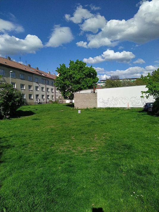 Střílím na takovéhle louce mezi domy. Mám odstup od terče až na 35 metrů. Dalo by se i 40, ale to by byl terč už rovnou u zdi a ta zeď je tvrdá. Nechceš někdy přijet? Praha, Horní Krč, na horním konci Jeremenkovy.