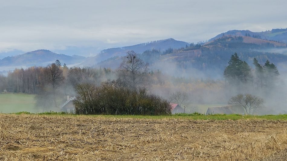 Předpověď na víkend nebyla nic moc, ale kdo se bojí nesmí do lesa, a já do lesa chtěl. Pozitivní bylo, že nemělo po nocích pršet. Takže jsem sbalil hamaku a pončo a v pátek večer vyrazil. Autobus mě vyvezl na kopec za městem, kde jsem měl vyhlédnutý pěkný plácek s výhledem na Radhošť a Veřovické vrchy. Za svitu měsíce jsem doklopýtal na místo a byl nemile zaskočen smradem linoucím se z doutnajícího ohniště. Kdosi tam přede spálil nějaký sajrat. Oheň jsem dohasil a vyhodnotil stav ovzduší za uspokojivý. Ráno jsem neznačenými cestičkami, polem, nepolem, lesem a blátem došel do hospody v Jablůnce na oběd. Cestou začalo pršet, ale zároveň okolní údolíčka pomalu zaplavovaly řídké mlhy, takže o hezké výhledy bylo postaráno. Pokračování na další kopec už bylo povětšinou po asfaltu. Vzhledem k počasí mi to ani tak nevadilo, ale stejně jsem kvůli focení každou chvíli odbíhal na louku do mokré trávy. Hospůdka na Lázoch, kam jsem měl namířeno, bývá naším oblíbeným cílem výletu. Místní dámy vytvořily ze zaplivané putyky příjemnou vesnickou hospůdku s domácím jídlem. I dobré kafe tam člověk dostane.
