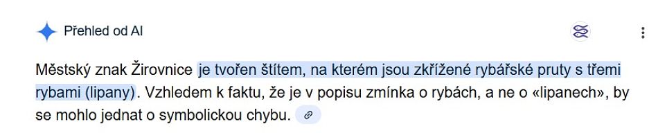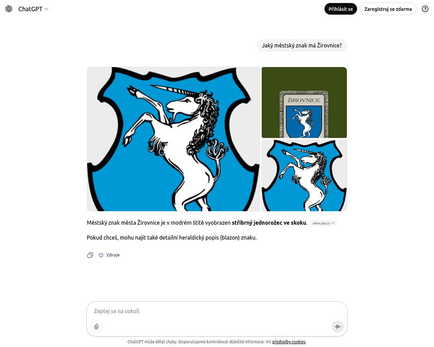 Kdekdo vychvaluje umělou inteligenci. Já od ní teda ještě rozumnou odpověď nedostala. Hodila jsem otázku, jaký městský znak má Žirovnice. První je odpověď AI, druhé skutečný obrázek znaku.
