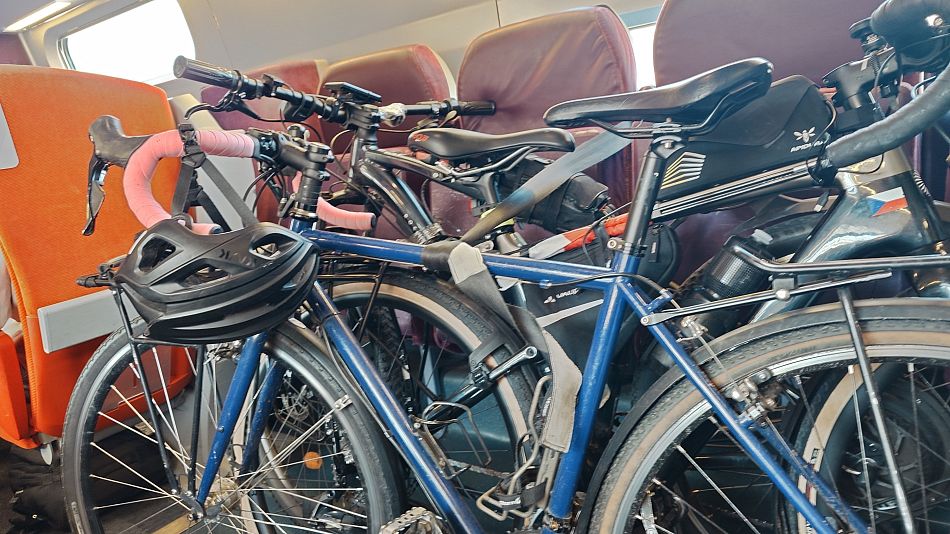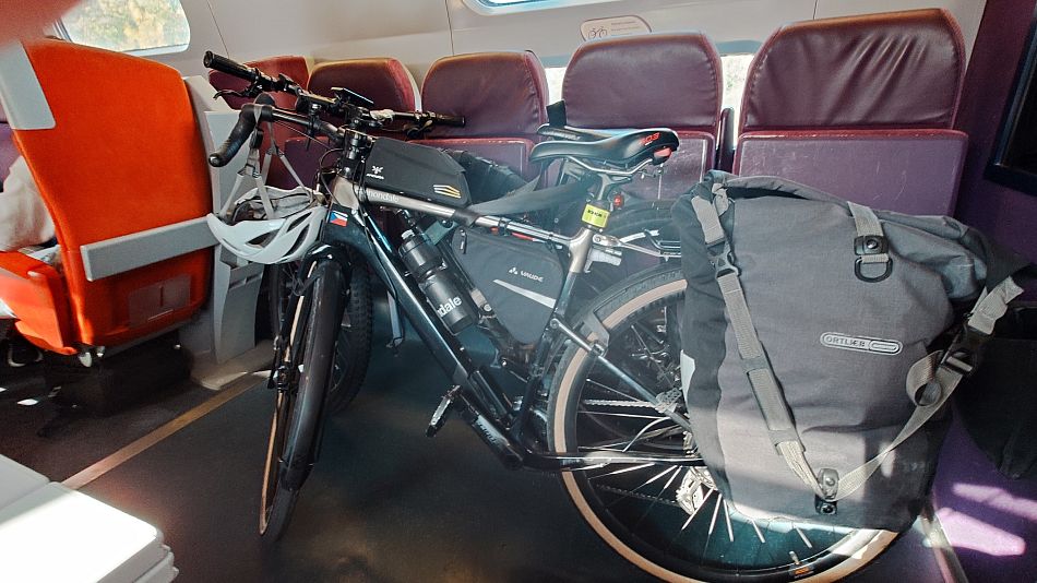 Když člověk chce vlakem na jih, je to potřeba plánovat dost dlouho dopředu. Do TGV se vejdou maximálně 3 kola, je to specielní kupé v prvním vagónu. Našinec by si řekl, propána, kdo by se koncem října vláčel do vlaku s kolem. No, měli jsme plno. Chtěl jsem jet 23/2, ale volné místo s kolem bylo jen 21/2 - v sobotu.