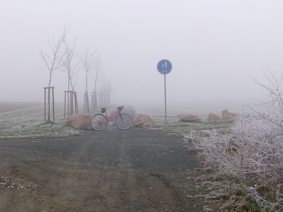 Boty, návleky, a tak sice v suchu, ale skoro až bolestivě zaškrcené haksny,manžety u treter jsou fakt přísné. Ještě, že jsem si moudře naplánoval jen kousek, 95 km do Crailsheimu.
