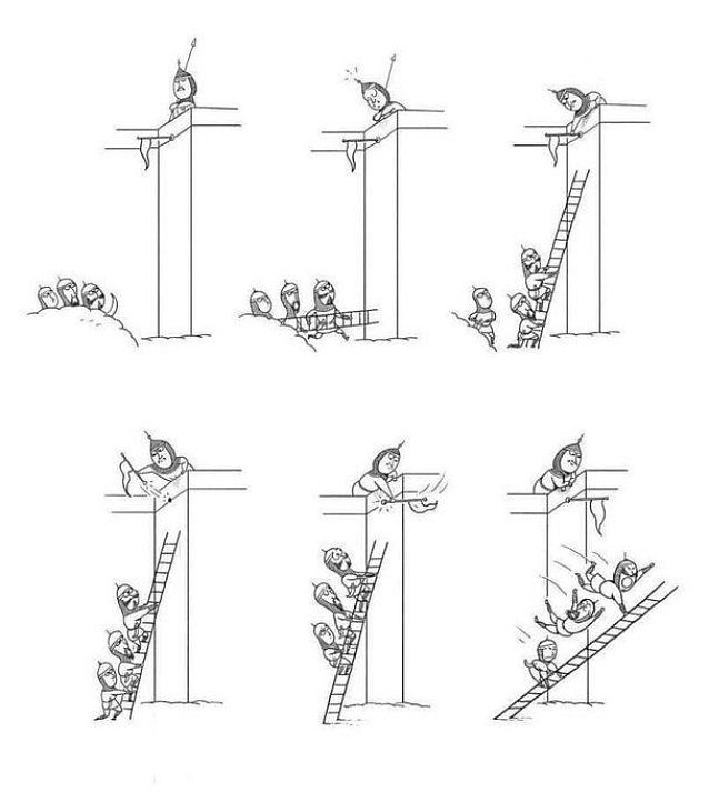 Jsem natvrdlý, alekse je ten vtip? Pán nahoře zaráží praporek z druhé strany, jakoby zevnitř hradeb a žebřík se propadá skrze hradbu. To je pro útočníky blbé, ale proč se smát?