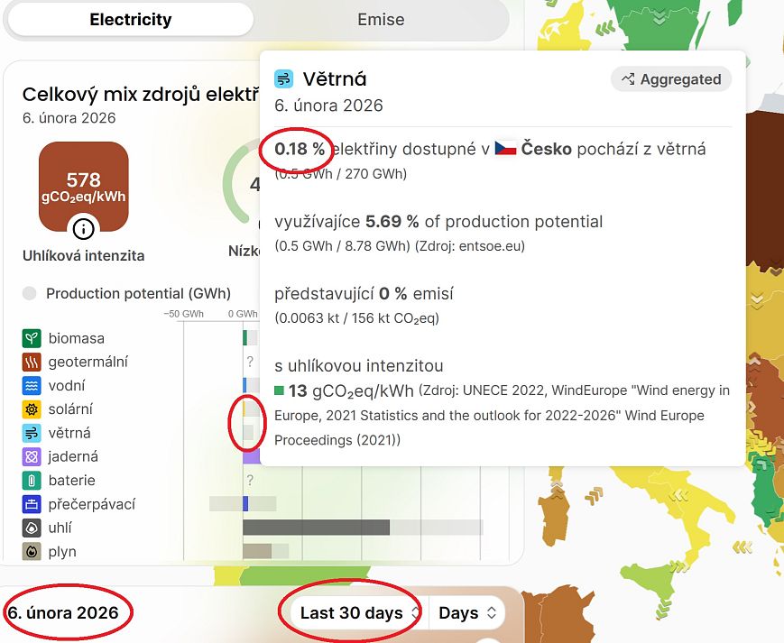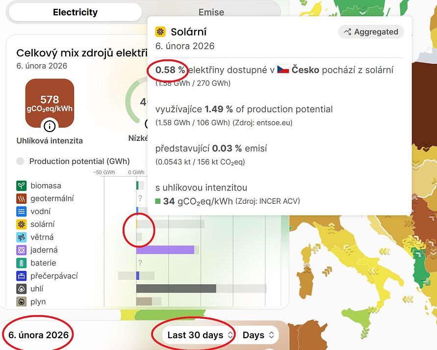 Na obrázcích je stav dodávek energie ze solárů a větrníků v Česku za posledních 30 dní. Už jsem si objednal dvě ovce a budu si plést svetry.