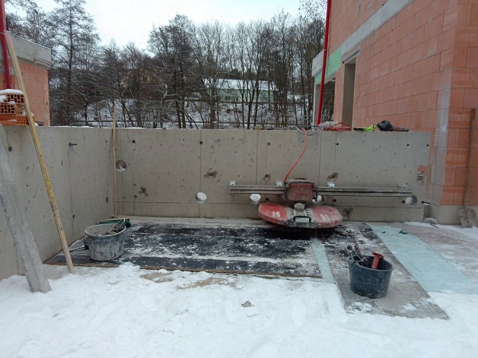 Pan projektant jaksi zapomněl, že pro přístup na terasu není optimální přelézat betonovou zeď vysokou 130 cm a silnou 25 cm. Fajn, výdělek pro nás. Armovaný masiv řežeme na malé kousky 1 x 1 metr o hmotnosti asi 600 kg.