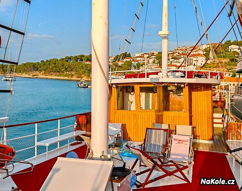 - Možnost posezení na vrchní slunné palubě s lehátky (120 m2) a zadní palubě, která je krytá proti větru a dešti